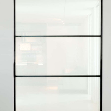 BOTH DOORS INCORPORATE LIGHT-COLORED LINEN FABRIC, WHICH CHANGES ITS SHADES ACCORDING TO THE LIGHTING, CREATING A SOFT AND PLEASANT ATMOSPHERE IN THE SPACE.