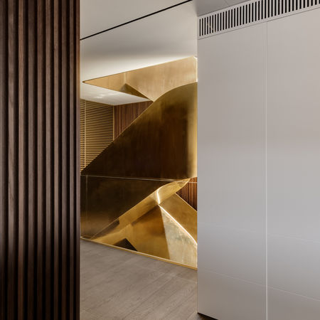 STAIRCASE MADE FROM BRONZE AND REFLECTION POOL MADE FROM BLACKENED FINISH TITANIUM.