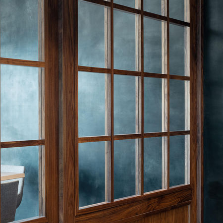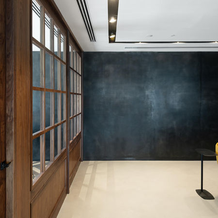 THEREFORE, WE CHOSE WEATHERED STEEL OVER SHINY AND GOLDEN METALS. THE ENTIRE LARGE WALL IS COVERED IN ONE CONTINUOUS SHEET WITHOUT CUTS.