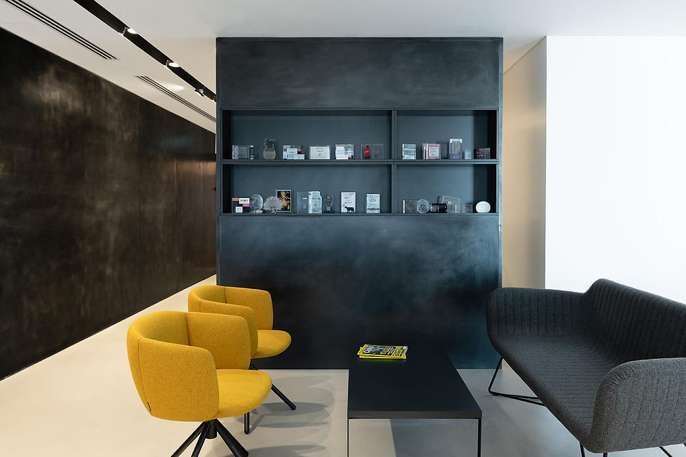 THE RECEPTION DESK IS DESIGNED TO COMPLEMENT THE LIBRARY, WITH STRAIGHT AND MODERN LINES, AND THE COMPANY LOGO IS MADE OF POLISHED BRASS, PROVIDING A TOUCH OF LUXURY WHEN APPROPRIATE.